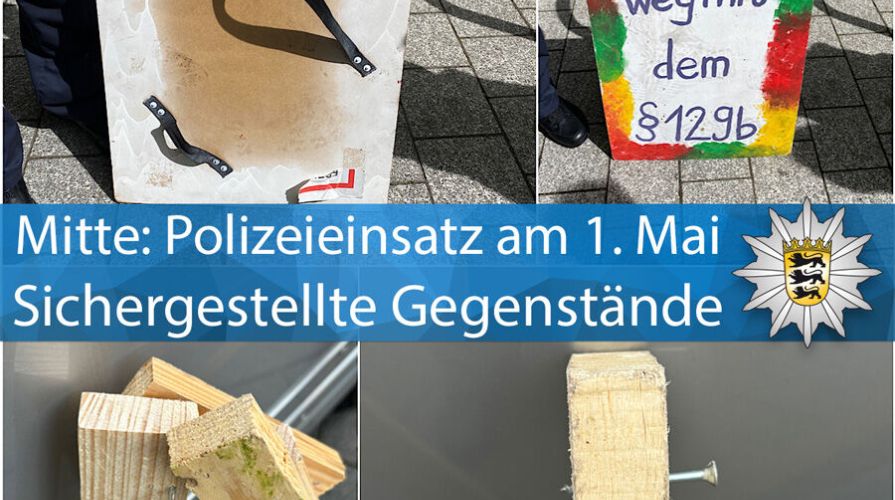 Fotos oben: Sichergestellte Gegenstände 1. Mai-Demo Stuttgart. Fotos: Polizei Stuttgart