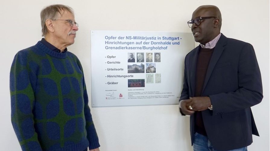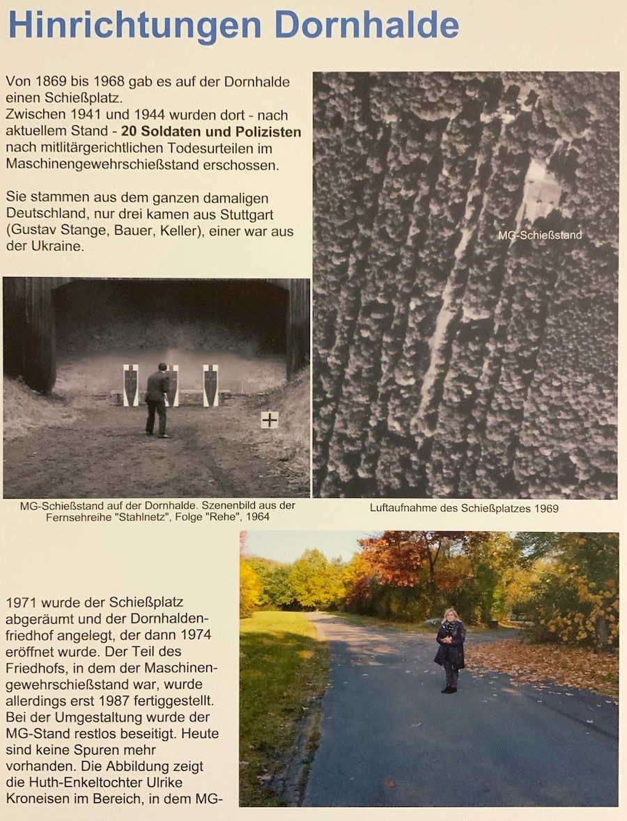 Eine Einführung in die Ausstellung gab Dr. Bertram Maurer. Sie basiert in großen Teilen auf der Arbeit der Geschichtswerkstatt Degerloch und berührt am Rande auch Zuffenhausen. Maurer beschäftigt sich seit Herbst 2016 mit der Geschichte des ehemaligen Schießplatzes auf der Dornhalde. Dort, wo sich heute der Dornhaldenfriedhof befindet – angelegt im Jahr 1974 – war von 1869 bis 1968 ein Übungsgelände des Militärs. Auf dem Maschinengewehrschießstand wurden von 1941 bis 1944 Todesurteile vollstreckt. Ein weiterer Maschinengewehrschießstand befand sich auf dem Burgholzhof. Ein Großteil der militärgerichtlichen Todesurteile wurde zudem im Lichthof des Landgerichts in der Urbanstraße mit dem Fallbeil vollstreckt. Auffällig ist, dass kein einziger Militärrichter nach dem Krieg strafrechtlich belangt wurde. Rund 2.000 Militärrichter – allesamt ausgebildete Volljuristen – waren auch nach 1945 wieder an Gerichten tätig, vermutlich auch am Landgericht Stuttgart.