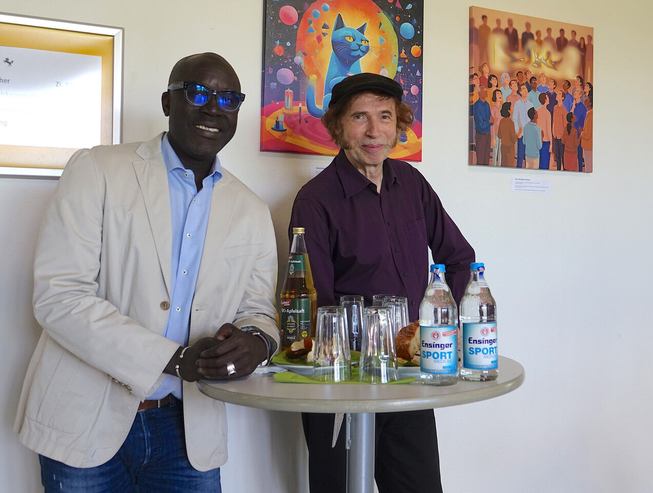 Unten: Bezirksvorsteher Saliou Gueye mit Medienkünstler Chris Mennel bei der Eröffnung