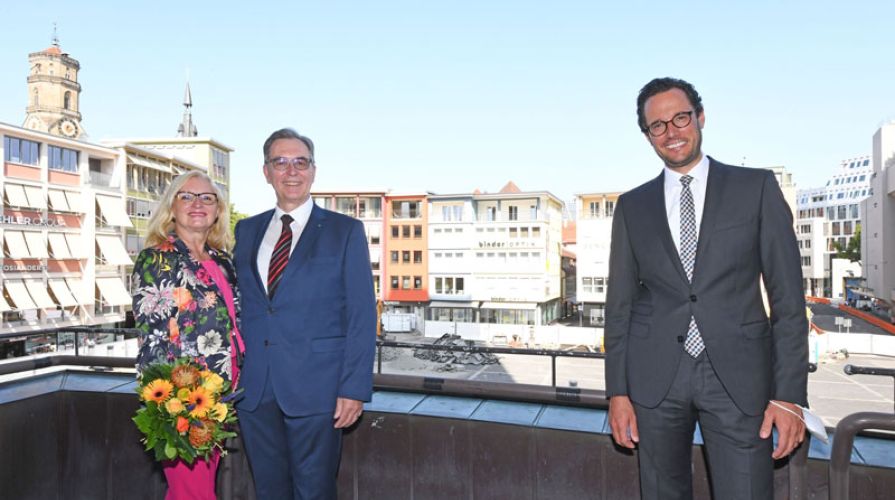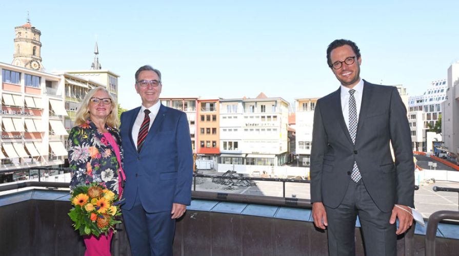 Erster Bürgermeister Dr. Fabian Mayer hat den langjährigen Bezirksvorsteher von Zuffenhausen, Gerhard Hanus, in den Ruhestand verabschiedet, mit dabei Ehefrau Angelika.