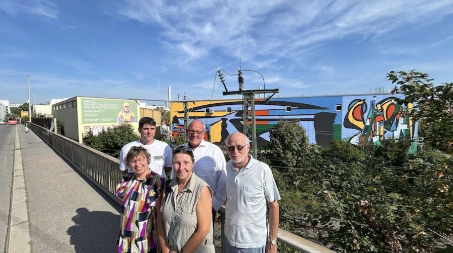 Freuen sich über die Neugestaltung des Umspannwerks Salzwiesen in S-Zuffenhausen (von links): Karin Buschkühl (Stv. Bezirksvorsteherin Zuffenhausen), Philipp Becker (Studio Vierkant), Susanne Bödecker (Bezirksbeirat Zuffenhausen, FrAKTION), Harald Hauser (Technischer Geschäftsführer Stuttgart Netze) und Wolfgang Machauer (Bezirksbeirat Zuffenhausen, CDU).