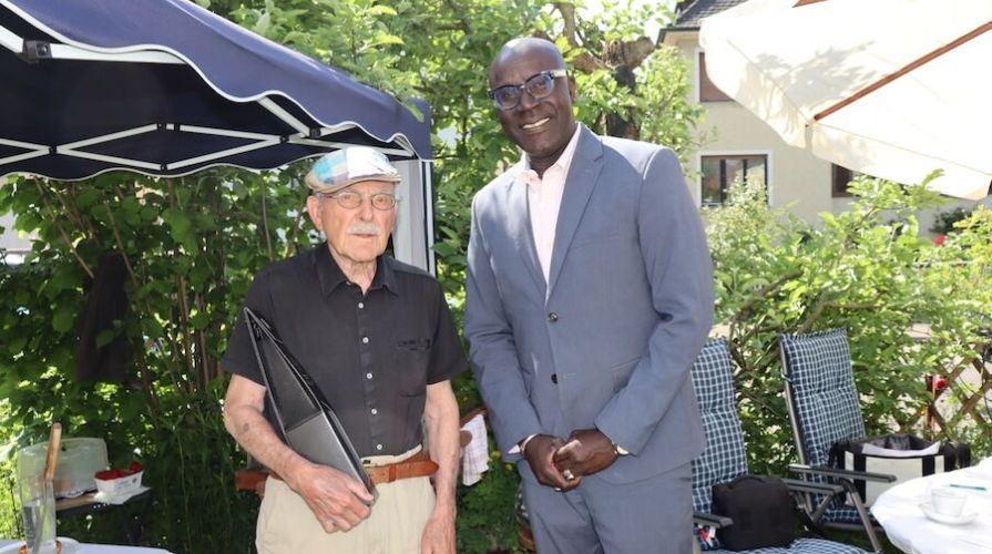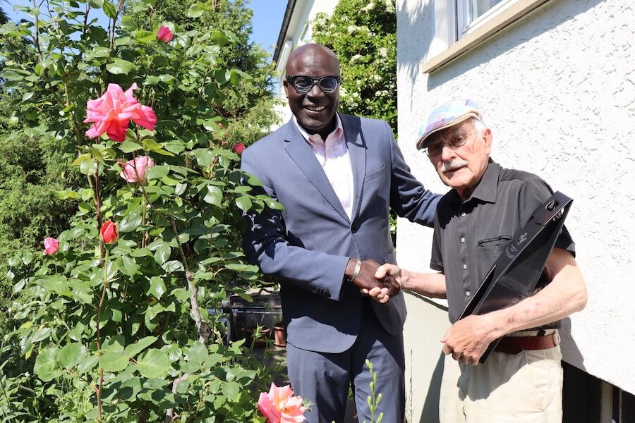Fotos: Bezirksvorsteher Saliou Gueye liess es sich nicht nehmen, Herbert Schneider persönlich bei einem Besuch zu seinem 90. Geburtstag zu gratulieren. Fotos: G. Friedel