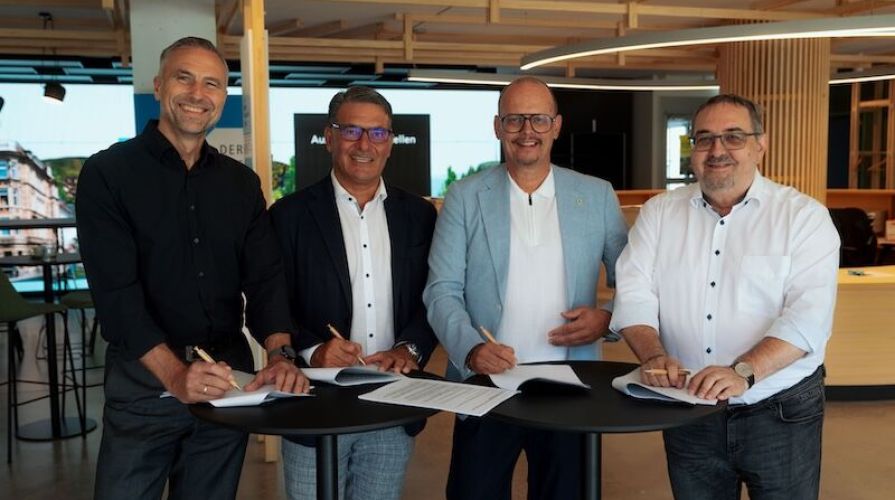 (V.l.) Bernd Heinl (Vorstandsvorsitzender der Baugenossenschaft Zuffenhausen), Peter Drausnigg (Technischer Geschäftsführer der Stadtwerke Stuttgart), Rüdiger Maier (Kaufmännischer Vorstandvorsitzender der Baugenossenschaft Neues Heim) und Gisbert Renz (Technischer Vorstandsvorsitzender der Baugenossenschaft Neues Heim) haben den Wärmevertrag in der EnergiePlaza der Stadtwerke Stuttgart offiziell unterzeichnet.