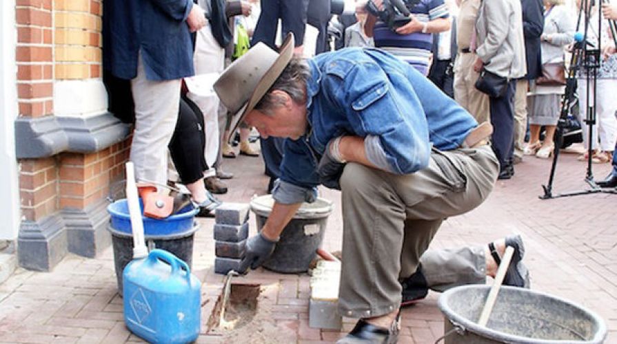 Foto: Stolperstein-Initiator Gunter Demnig bei der Verlegung eines Stolpersteins. Foto: Wikipedia, Joop Van Dijk